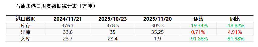 四季度開始國內石油焦市場延續上行走勢,市場整體成交表現活躍。由于前期外盤價格高位貿易商操盤謹慎,石油焦整體到港進口量減少,下游市場成交氛圍積極,港口現貨去庫速度加快。11月開始石油焦進口到港量減少,貿易商執行訂單合同積極疏港走量,市場整體出庫量大于入庫量,港口庫存降至305.3萬噸。