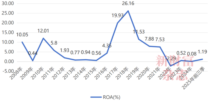 這樣快速的膨脹,帶來的后果之一是資產盈利能力的快速下降。以總資產收益率(ROA)衡量,遼寧方大集團ROA從早期的26%下降至*新的1.19%,這意味著其資產收益率甚至不及銀行定存利率,更難以覆蓋其貸款成本(圖8)。
