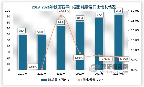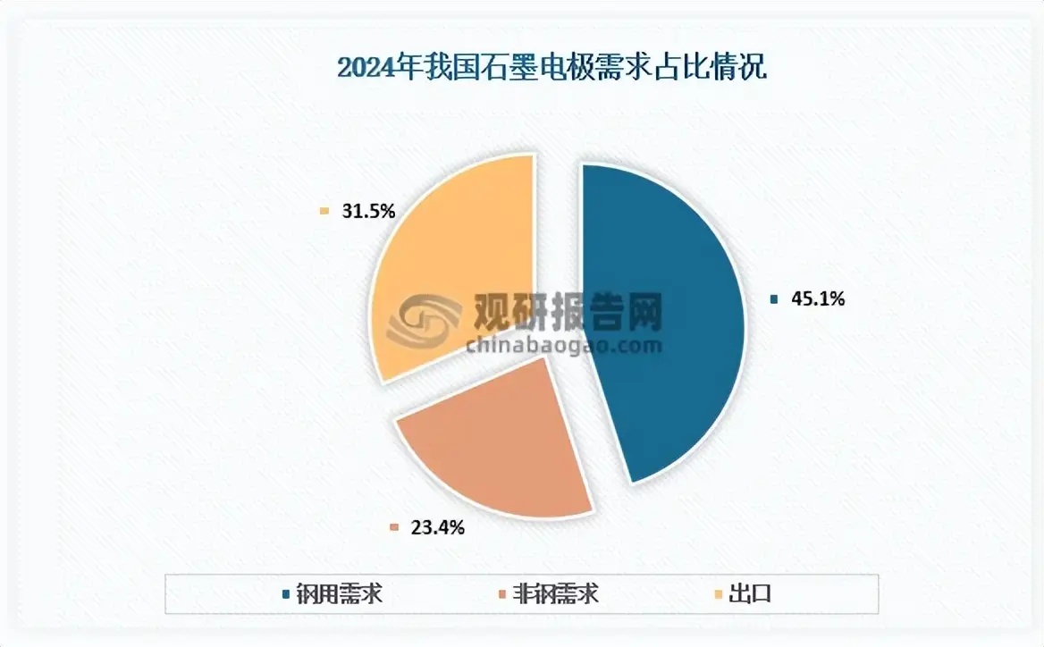 (2024年我國石墨電極總需求為92萬噸,其中鋼用需求為41.5萬噸,占比45.1%;非鋼需求21.5萬噸,占比23.4%;出口約為29萬噸,占比31.5%。數據來源:ICC、觀研天下整理)