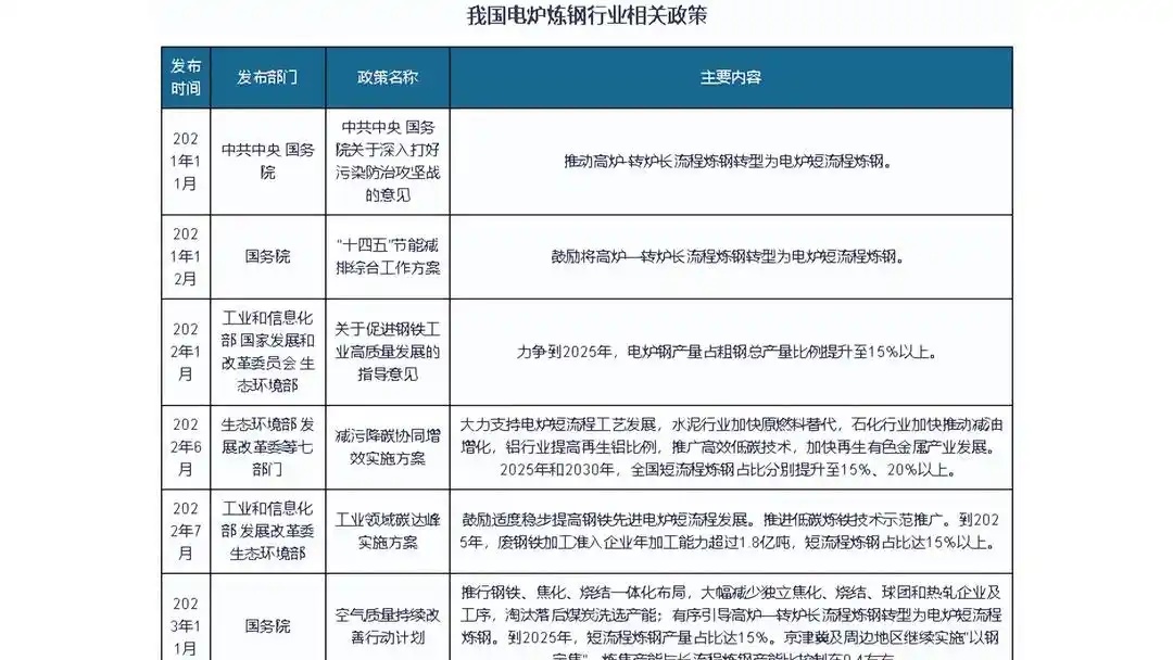 國家的目標很明確,《關于促進鋼鐵工業高質量發展的指導意見》直接把KPI拍臉上了:到2025年,電爐鋼產量要占到15%以上。