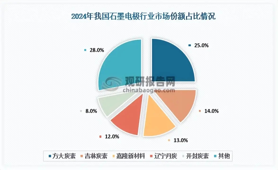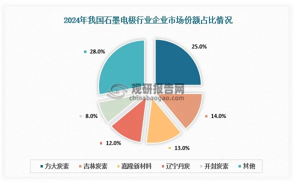 (我國石墨電極行業中方大炭素市場份額達25%,排名第一;其次是吉林炭素新材料,占比14%;嘉隆新材料占比13%。數據來源:ICC、觀研天下整理)